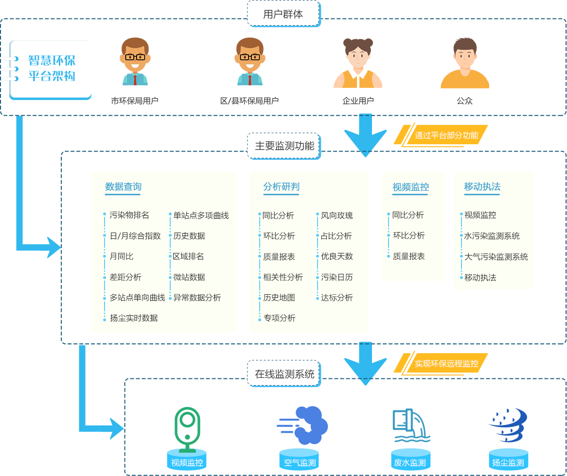 智慧環(huán)保平臺(tái)以環(huán)境感知物聯(lián)網(wǎng)為基礎(chǔ)、以大數(shù)據(jù)技術(shù)為核心,按照“環(huán)保部門統(tǒng)一監(jiān)管、企業(yè)主體責(zé)任、社會(huì)多元共治”的環(huán)境管理改革理念,致力于構(gòu)建管理和服務(wù)互融、數(shù)據(jù)和信息互通的“互聯(lián)網(wǎng)+”管理體系,助力提升環(huán)境管理能力、改善生態(tài)環(huán)境質(zhì)量、實(shí)現(xiàn)環(huán)境經(jīng)濟(jì)協(xié)調(diào)發(fā)展。